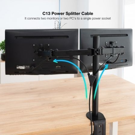 Conector CEE7 macho en un extremo y dos conectores C13 hembra en los otros.