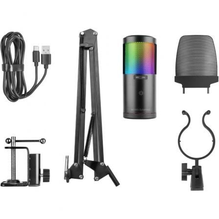 - Micrófono, brazo articulado, filtro anti pop, cable USB-A/USB-C y manual