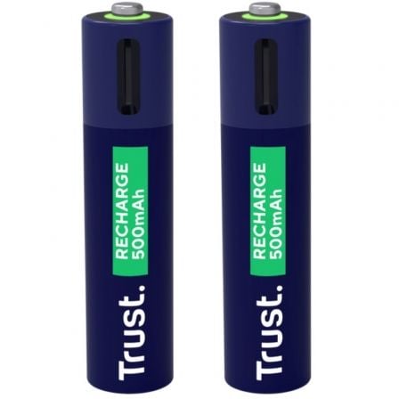 Las Trust USB-C Rechargeable AAA Batteries 2P son pilas recargables AAA que se cargan fácilmente mediante un cable USB-C. Ofrecen una solución práctica y sostenible, ideales para reemplazar cientos de pilas desechables con hasta 800 recargas. Incorporan indicadores LED para mostrar el estado de carga.