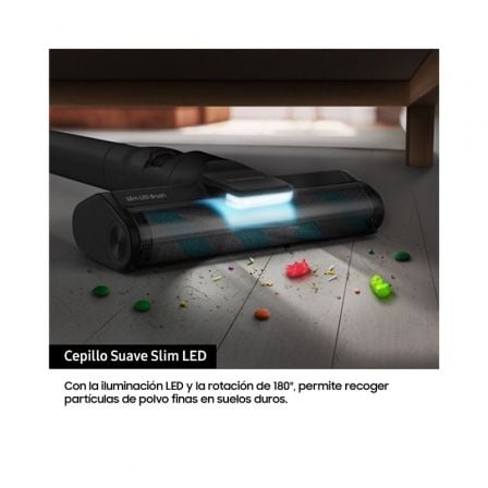 ‘Recoge el polvo fino de los suelos duros con el cepillo Slim LED con ‘iluminación LED para resaltar el polvo en las zonas oscuras. Es más fino’ y ligero, rota a 180° para que sea fácil manejarlo e incluye un rodillo’ antienredos en la parte delantera que reduce la cantidad de cabe