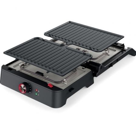 ‘Tiene una superficie de cocción de 27,5 x 18 cm, termostato regulable y, gracias a su apertura de 180º, también puede utilizarse como parrilla de mesa. Al ser desmontables las placas, su limpieza después del uso es muy fácil. 1800 vatios de potencia.