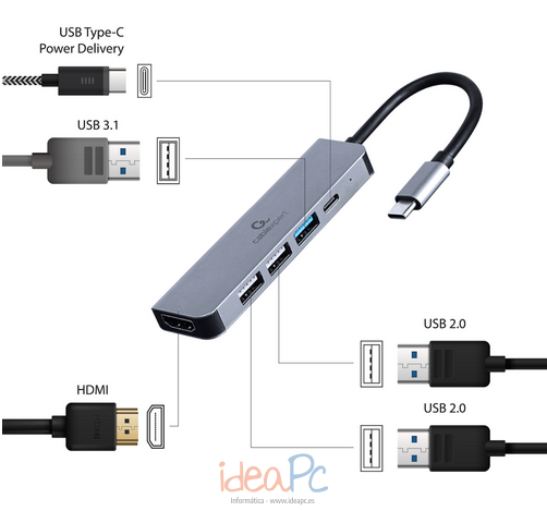 La mayoría de los hubs básicos ocupan el puerto de carga y te dejan trabajando con la batería. Este modelo incluye tecnología Power Delivery (PD), lo que significa que puedes conectar el cargador de tu portátil directamente al hub y este pasará la energía a tu equipo mientras utilizas el HDMI y los puertos USB.
