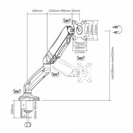 • Angulo de Inclinación: -45º / +90º. Angulo máximo de giro: 360º. ‘Ángulo máximo de rotación: 180º. Brazo articulado con pistón de gas para’ un ajuste fácil y cómodo.