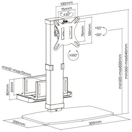 - Nota: Este soporte cuenta con un sistema de subida y bajada de tipo carraca. Para subir, simplemente sube el monitor hasta la posición que le guste. Para bajar, hay que subir el monitor hasta la máxima posición, y a continuación, le permitirá bajar el monitor.