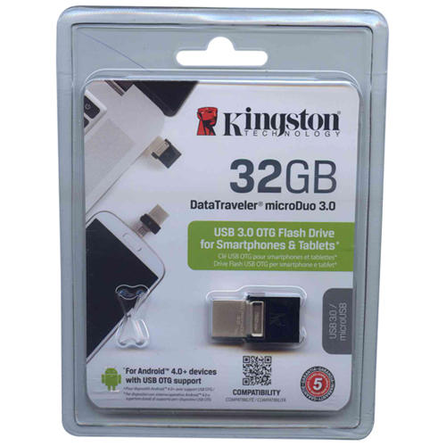 Pendrive Kingston MicroDuo de 32GB con soporte OTG y tecnología USB 3.0, ideal para transferencias rápidas en móviles y PCs.