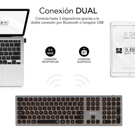 - El Teclado Inalámbrico SUBBLIM Master soporta 3 dispositivos ‘mediante dos canales con tecnología inalámbrica Bluetooth 5.2 y uno a ‘través de un receptor USB RF 2.4G.